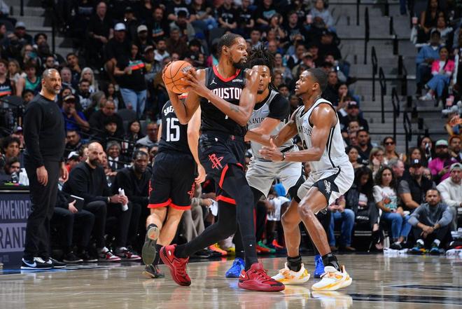 带着一连串荣誉和成绩迎接这场“德州内战”,马刺自然也是更快进入状态的一方。比赛一开场,文班亚马就内突外投连得8分,此后,马刺一度将分差拉开到两位数,不过火箭也做好了准备,他们一开场就利用申京强打文班亚马。随着杜兰特的手感复苏,火箭在首节还剩两分钟的时候完成反超。